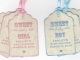 This listing is for Baby Shower Favor Tags / Sweet Baby Girl / Sweet Baby Boy / Gender Reveal / New Baby / Pink / Blue - Set Of 20 Vintage Style. These tags are printed on quality 65# Astroparche Card Stock with either baby blue or baby pink ink. Each tag measures 1-3/4" X 2-3/4" and will be pre-strung with light pink or light blue satin ribbon. The tags are blank on the back for a short message or signature.